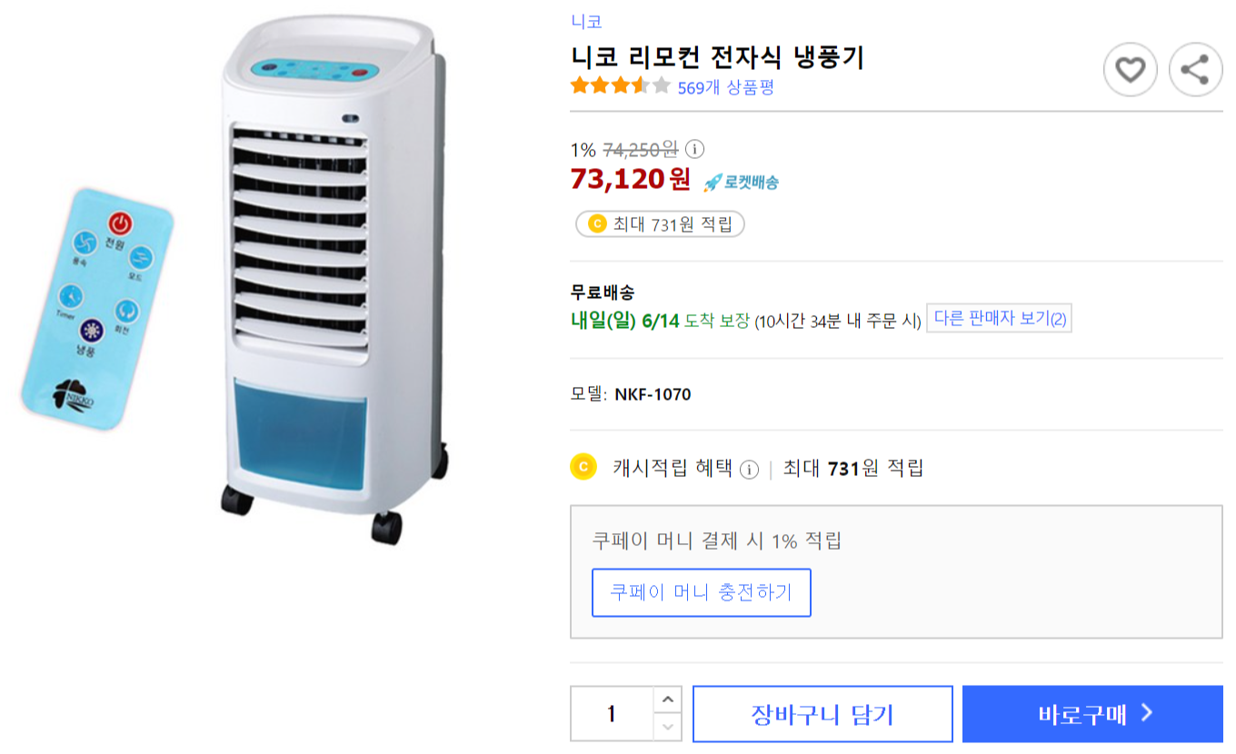 보통 10만원 전후의 가격대로 형성되어 있고, 이번에 제가 추천하는 재품은 10만원 미만의 '니코 리모컨 전자식 냉풍기' 제품입니다.