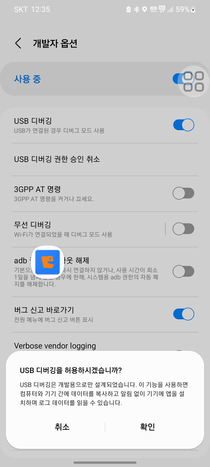 6. 이제 휴대폰에서 usb 디버깅을 설정해 줍니다.