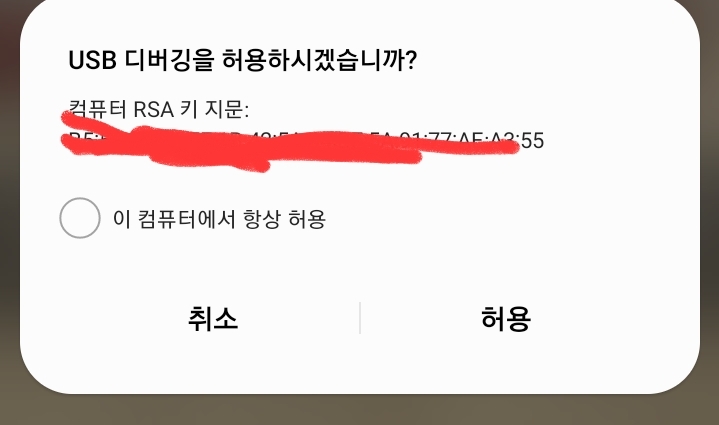 8. 실행하면 아래와 같이 휴대폰에서 USB 디버깅 허용 여부를 물어 보는데, '예' 를 눌러 주시면 됩니다.