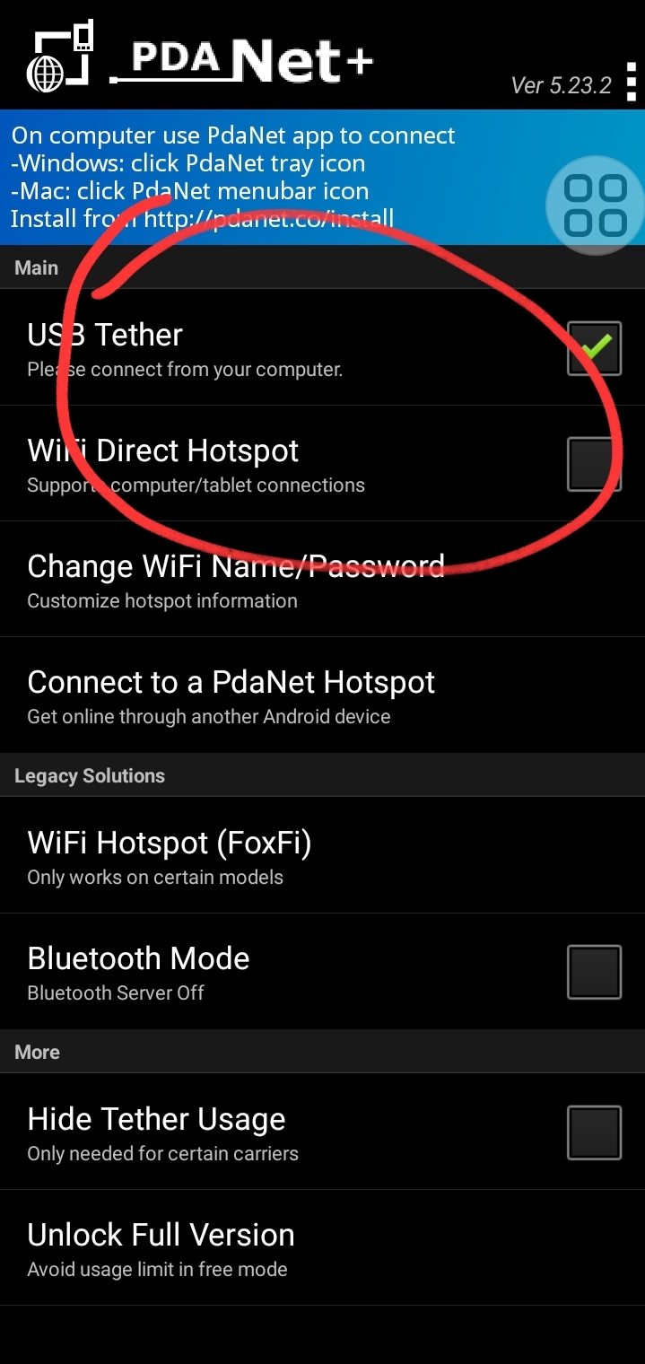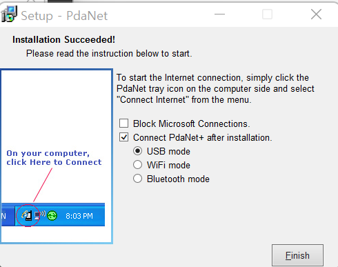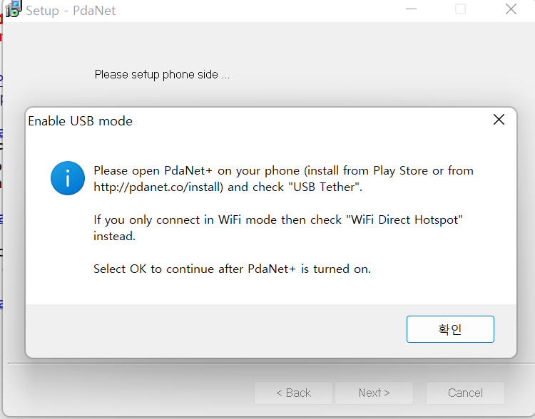connect pdanet+ after installation 체크 후, 'usb mode' 선택